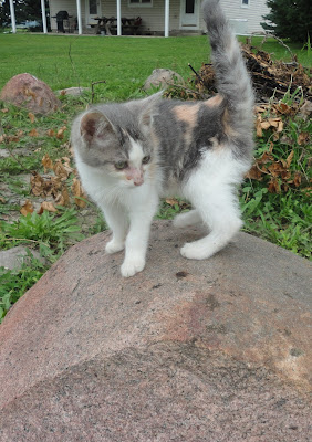 Between four Border collies and trap/neuter efforts, we've kept stray cats to a minimum on the farm. But this one appeared while I was at a sheepdog clinic. And so far, I've found no one who wants an adorable kitten--so, for now she's staying.